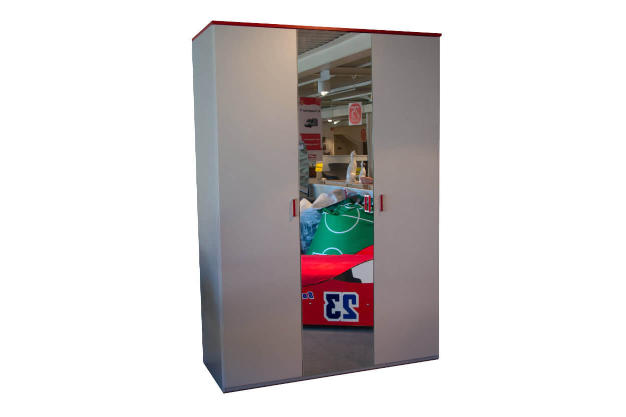 Armoire 3 portes avec miroir, corps + faces en blanc, plateau + socle rouge