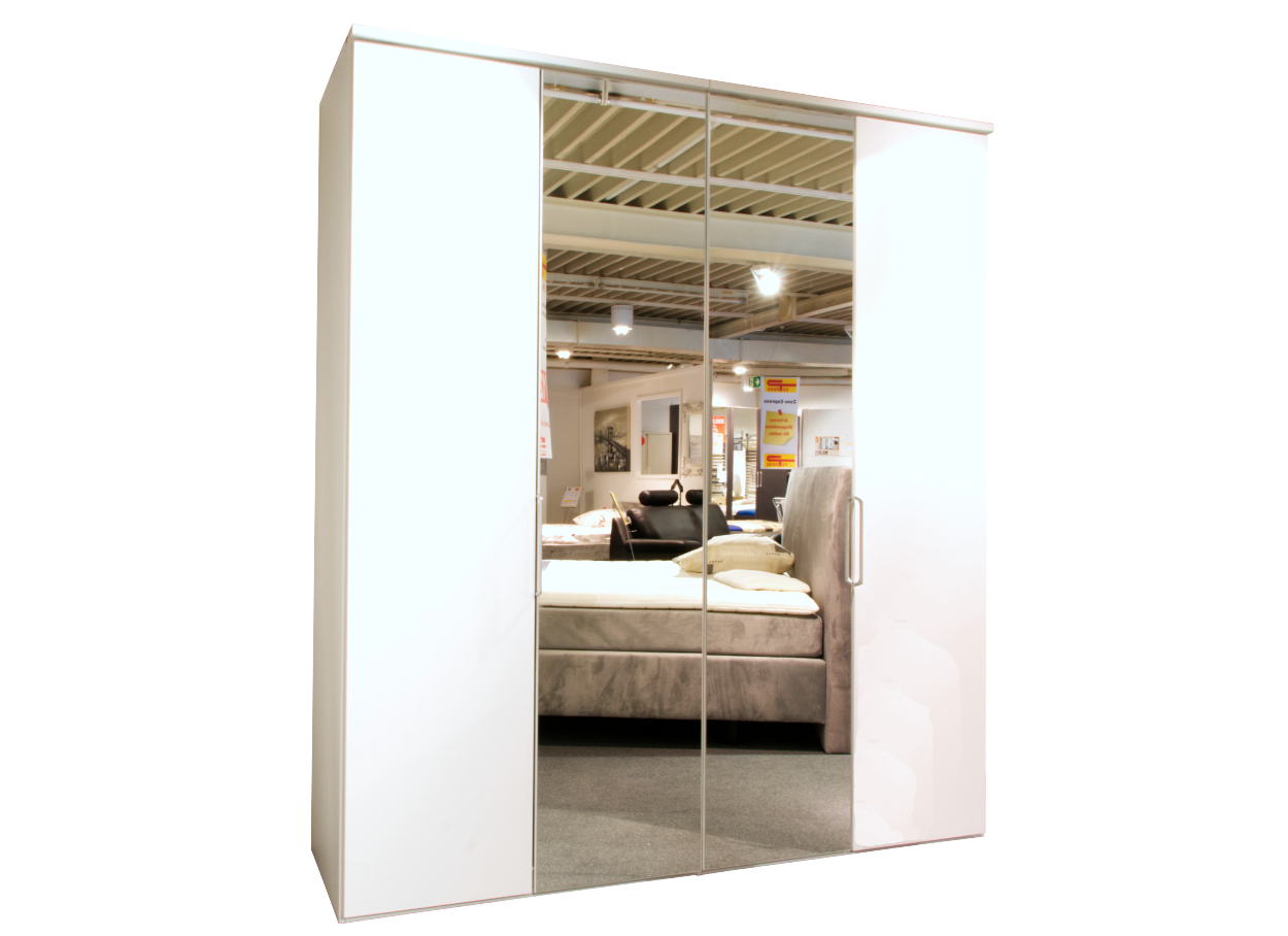 Armoire, corps d'élément et faces en blanc polaire, coloris intérieur en imitation bouleau, poignées version alu mat, avec 4 sets de 2 freins de portes