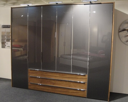 Armoire corps d'élément en imitation noyer de macadamia, les façades sont en verre graphite et les poignées en chrome