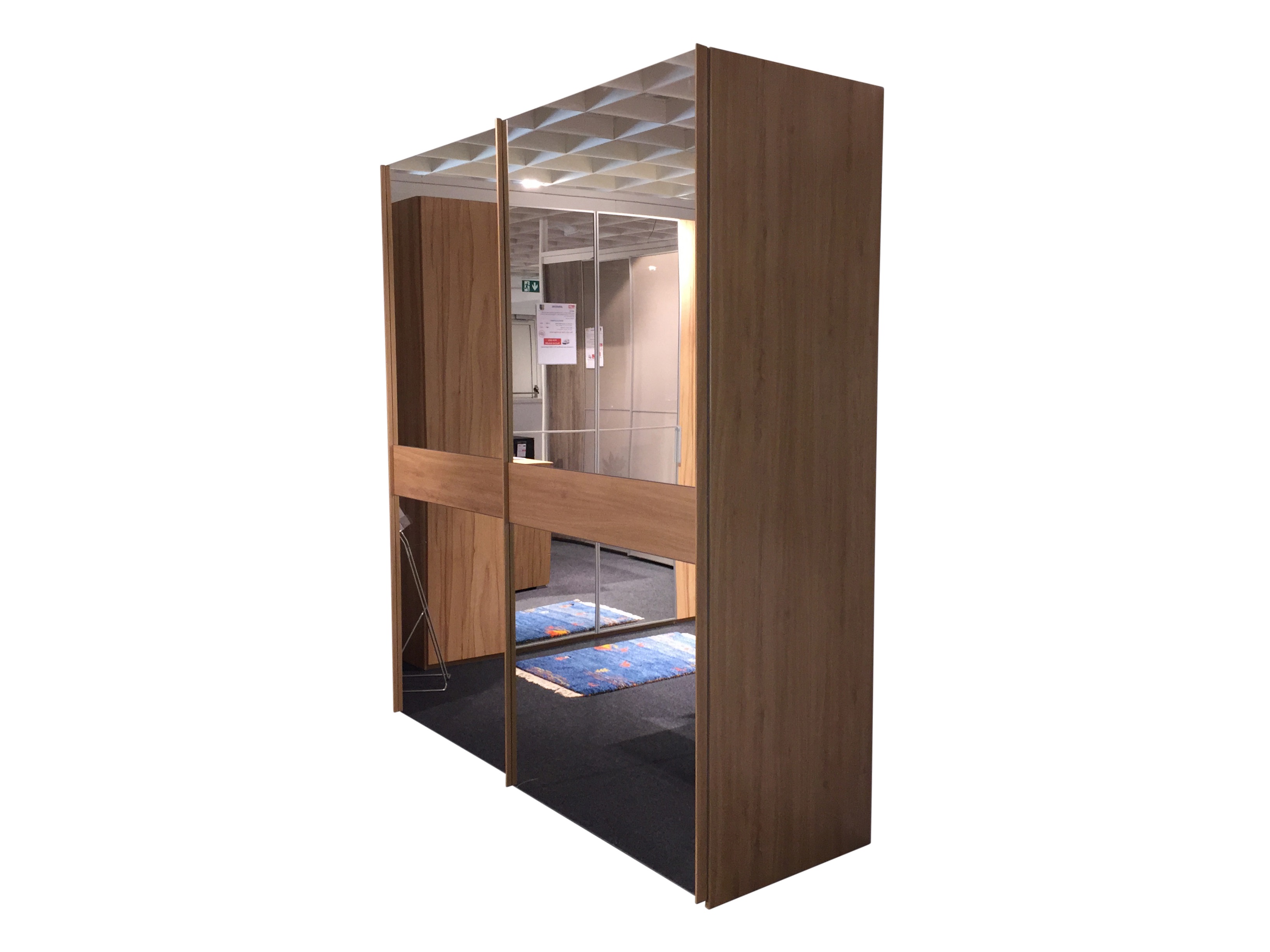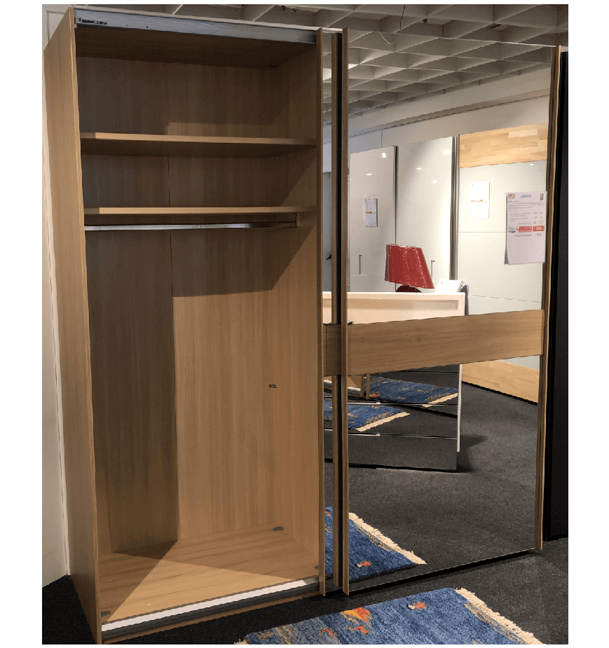 Armoire 2 portes coulissantes, faces miroirs, corps d'élément imitation chêne à noeuds vierges, intérieur du corps en imitation hêtre, poignées et barres en imitation chêne à noeuds vierges, inclus 1 kit d'amortisseurs de porte
