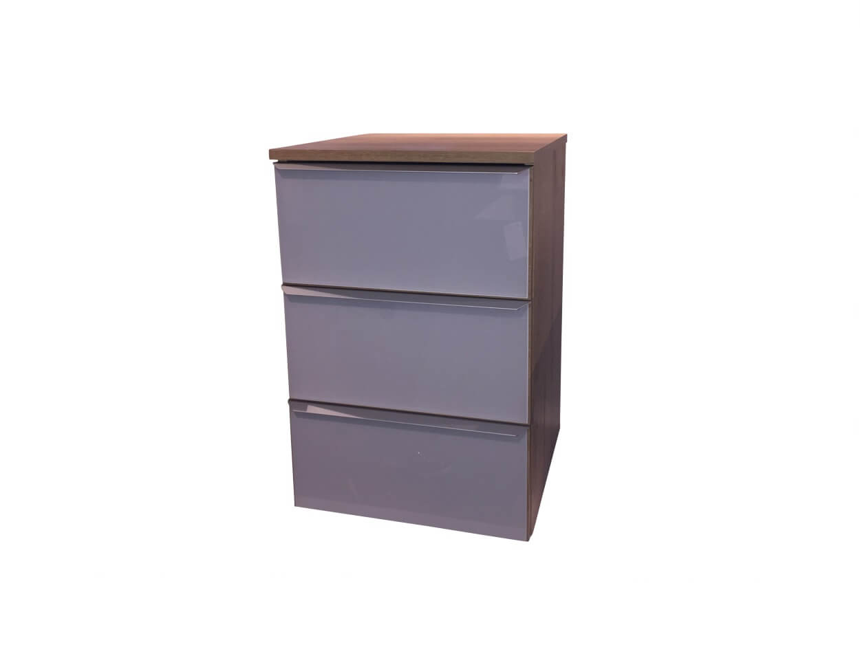 Chevet avec 3 tiroirs, corps en imitation chêne Riviera U9, faces en verre gris soie, intérieur aspect lin Twist X1, poignées en alu mat, pieds noir