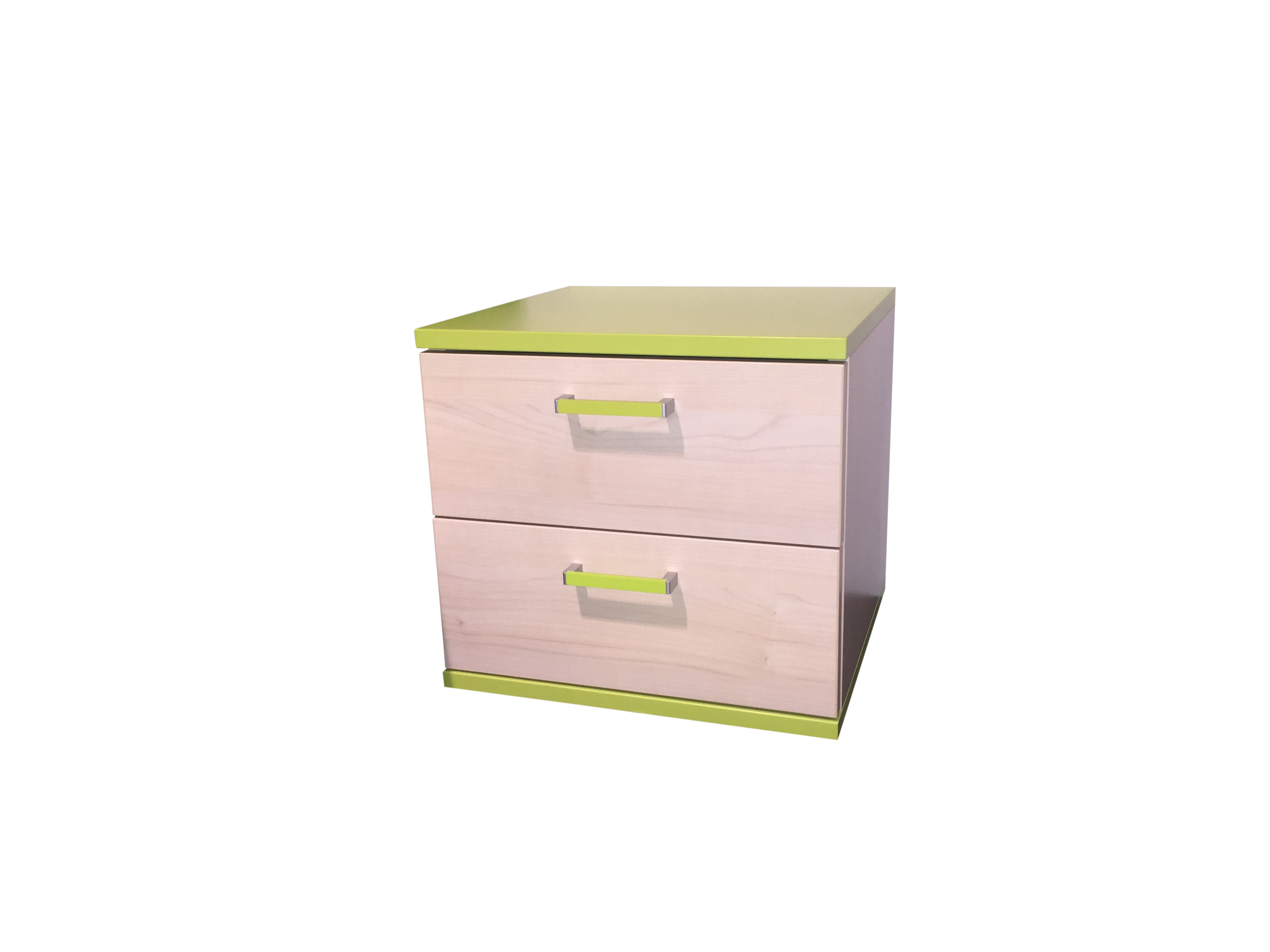 Chevet 2 tiroirs, corps et faces en imitation érable, plateaux et fonds limette, poignées limette