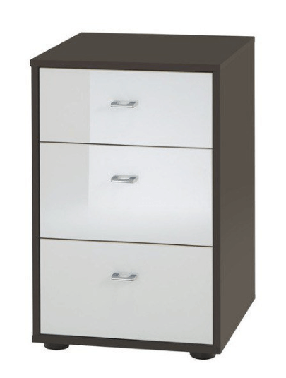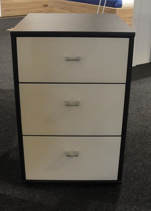 Chevet 3 tiroirs en corps noir, faces verre Magnolia et poignée argentée