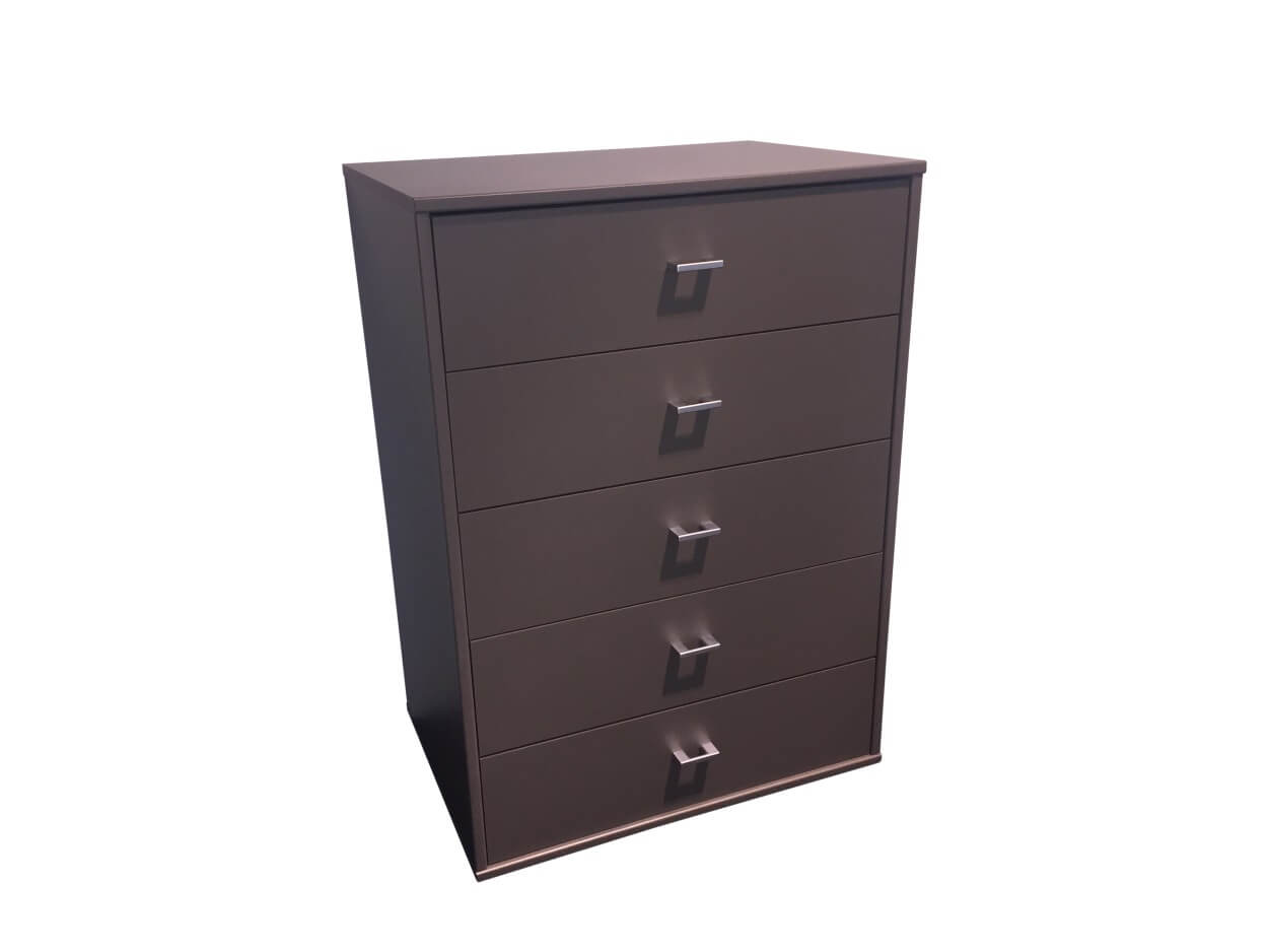Commode 5 tiroirs en corps et faces imitation Havanna et les poignées argentées