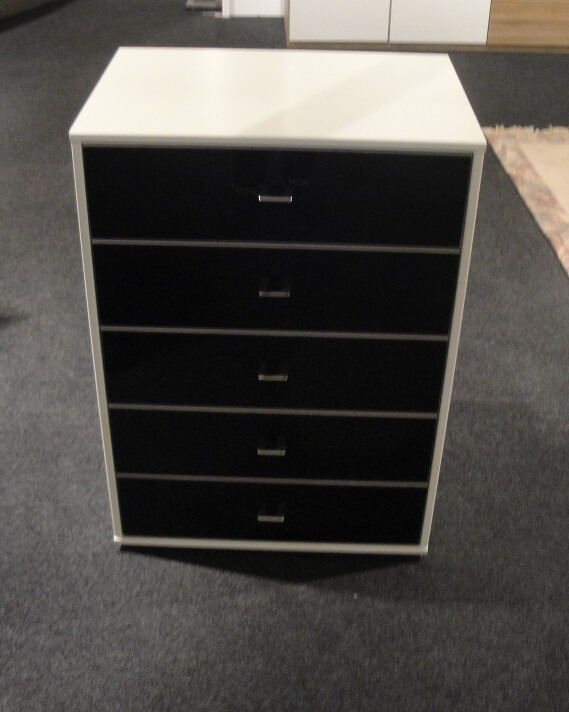 Commode 5 tiroirs en corps blanc, faces en verre noir et poignées chromées