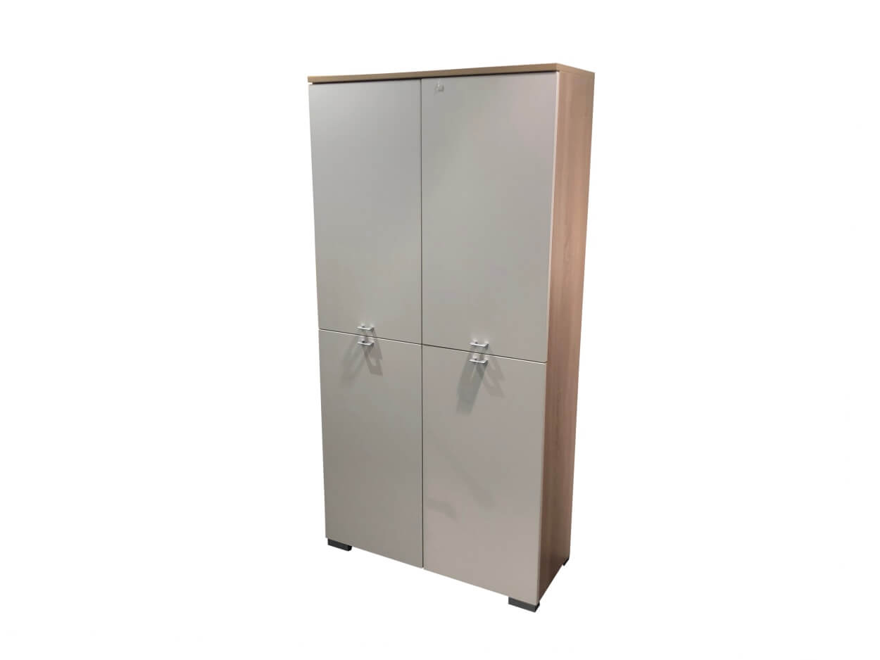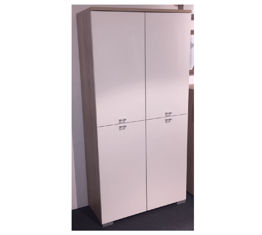 Commode 4 portes, corps en imitation Bardolino chêne, faces en blanc mat, poignées alternative alu mat