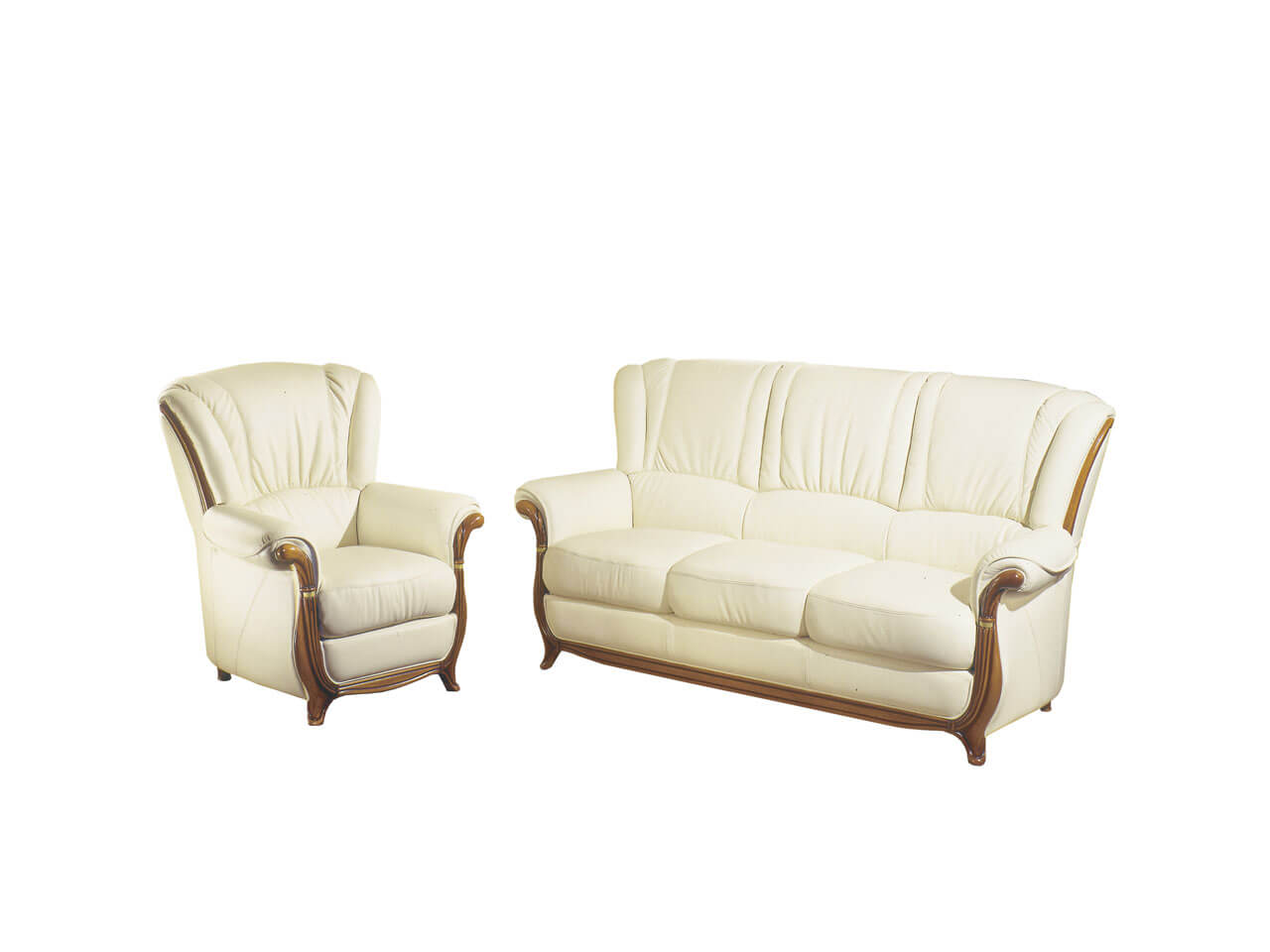 Canapé 3 places fixes + 1 fauteuil en recouvrement cuir, couleur Madrid soft-line, bois merisier antiquaire satiné mat
