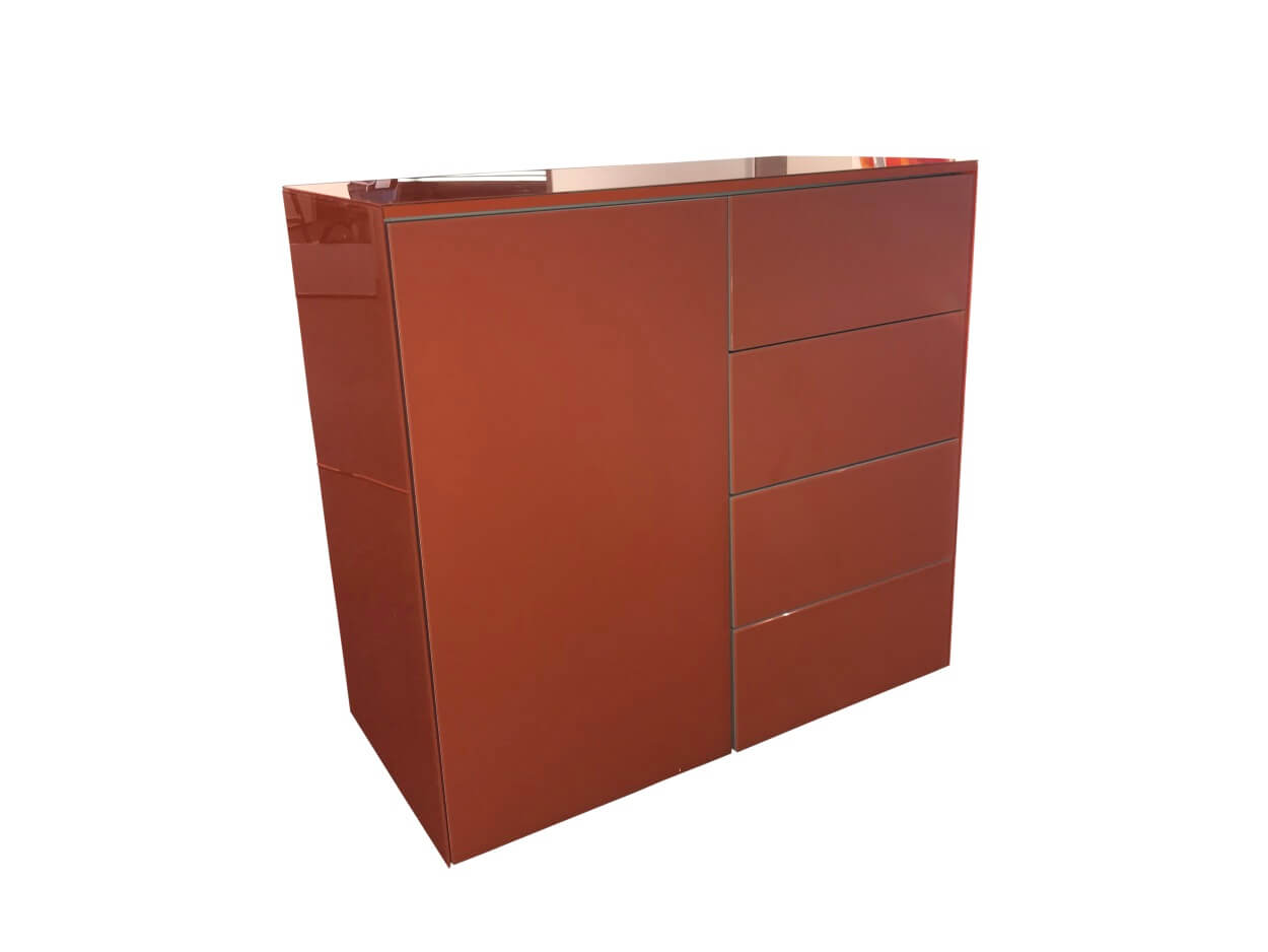 Commode, 1 porte et 4 tiroirs avec ouverture totale, corps et faces en verre orange mat, plateau en verre orange mat, poignées chrome