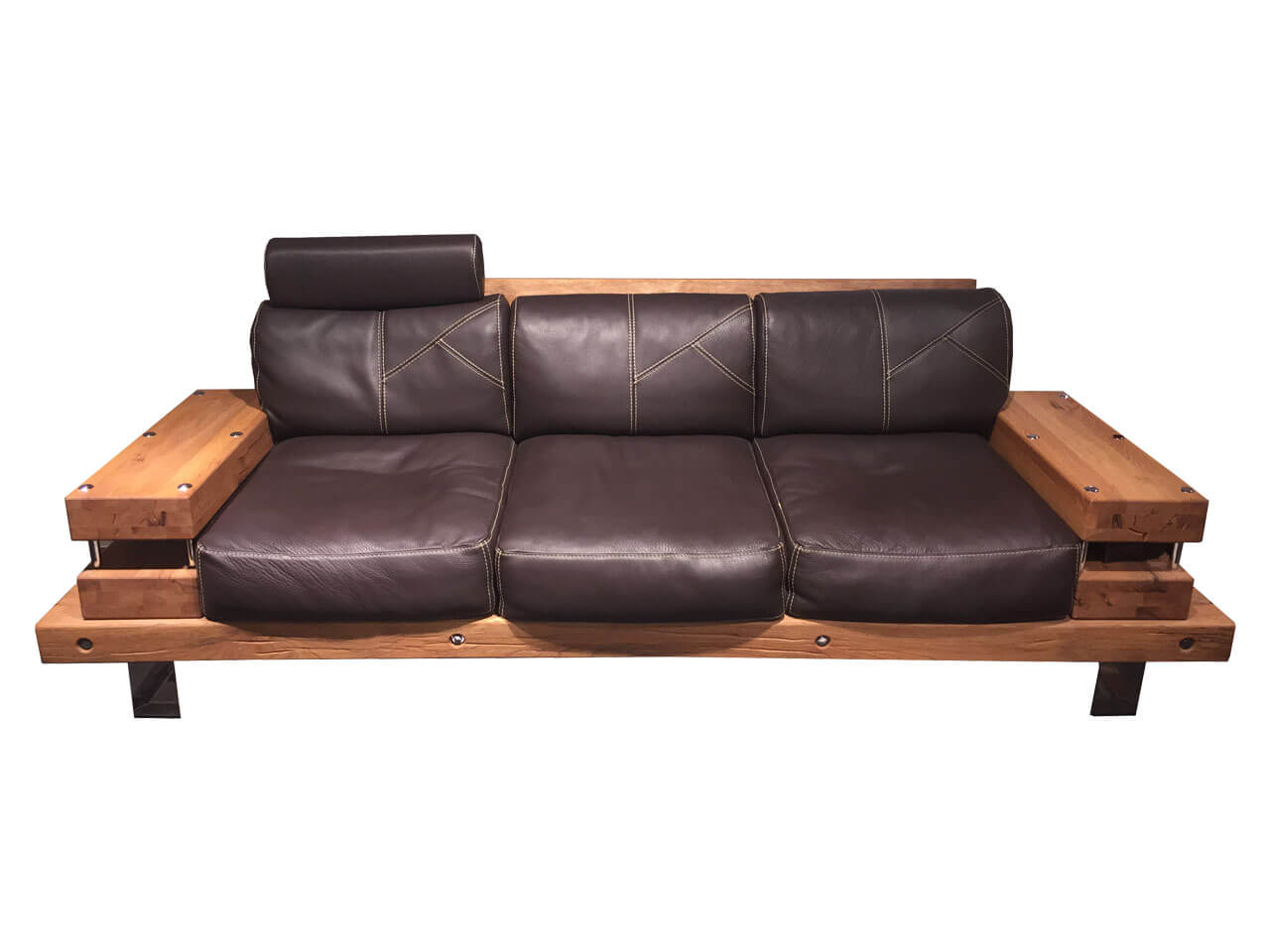 Canapé* 3 places en chêne des marais brossé massif huilé nature patiné (2), assise et dossier en cuir Nacken-Leder Braun et coutures contrastées nature, piétement en métal, avec appui-tête en cuir